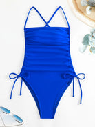 Introducing the Royal Blue One Piece Drawstring Suit, a stunning example of elegance fused with functional design. This sleek swimsuit is expertly crafted from a durable blend of nylon and spandex, ensuring a comfortable and flattering fit. The rich royal blue shade exemplifies sophistication and style, making it a striking choice for any waterside occasion. The suit features an adjustable drawstring detail that allows for a customizable fit, while the backless design adds a daring touch of allure.