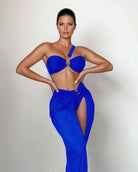 Experience elegance with the Solid Color Three Piece Metal Bikini Set, blending modernity and classic charm. Expertly crafted with nylon and spandex for durability and a perfect fit, the bikini moves with you in comfort. The set is presented in a serene, solid blue color, creating an aura of tranquility and depth. Intriguing metal detailing on the bikini elevates the overall look, adding a touch of glamour and refinement. The ensemble is completed with a chic tie-around skirt featuring a distinctive metal buckle, ensuring this set stands out in simplicity and style.